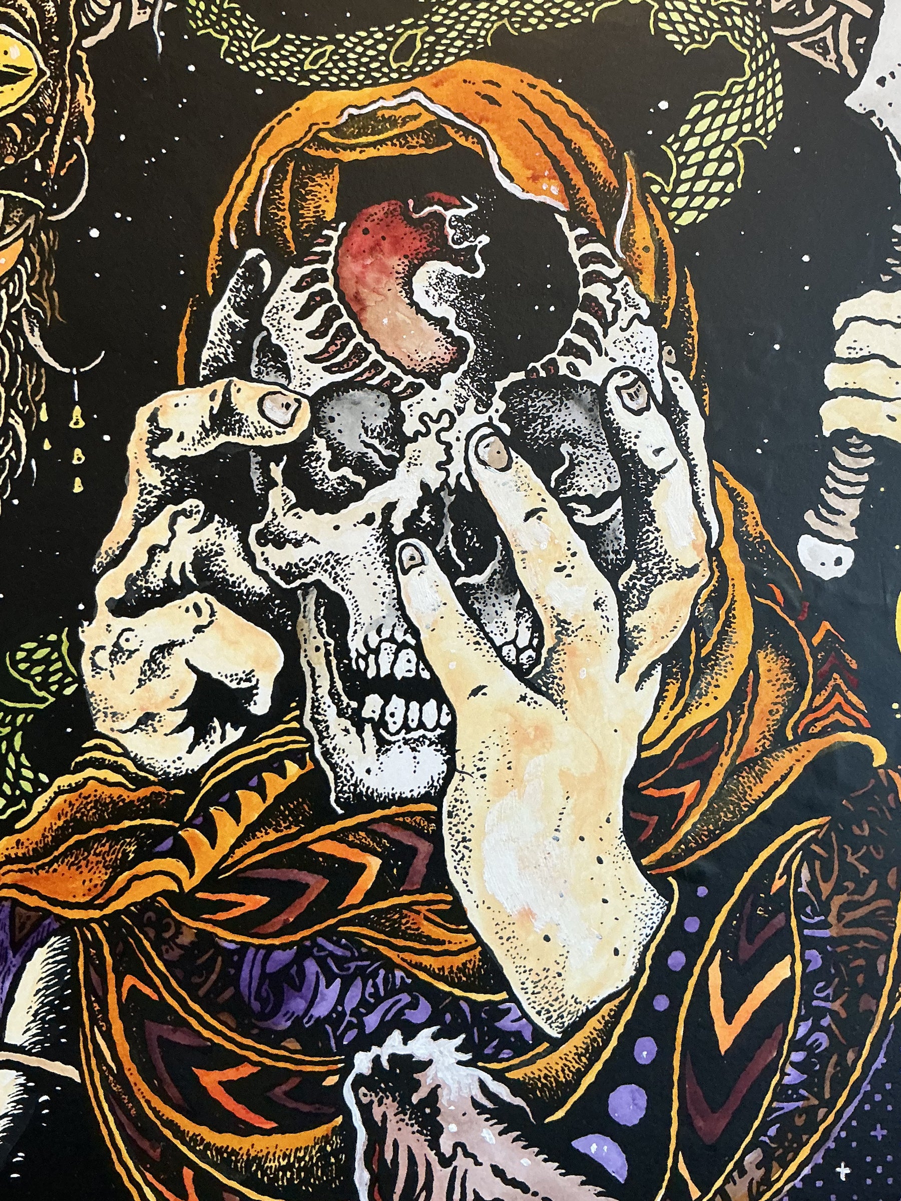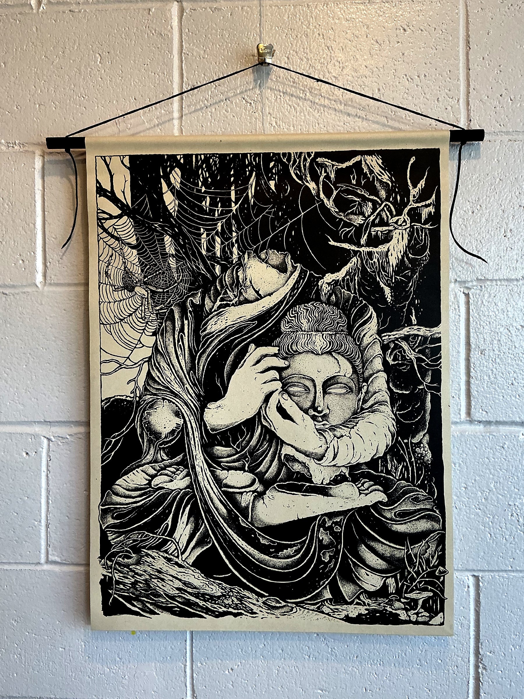All work was composed by hand utilizing India ink on wood panel.David’s inspiration includes Hindu mythology , William Blake, the Pacific Northwest landscape, bible parables, Hatha Yoga, turn of the century illustration, transcendental music, and the art of printmaking itself.